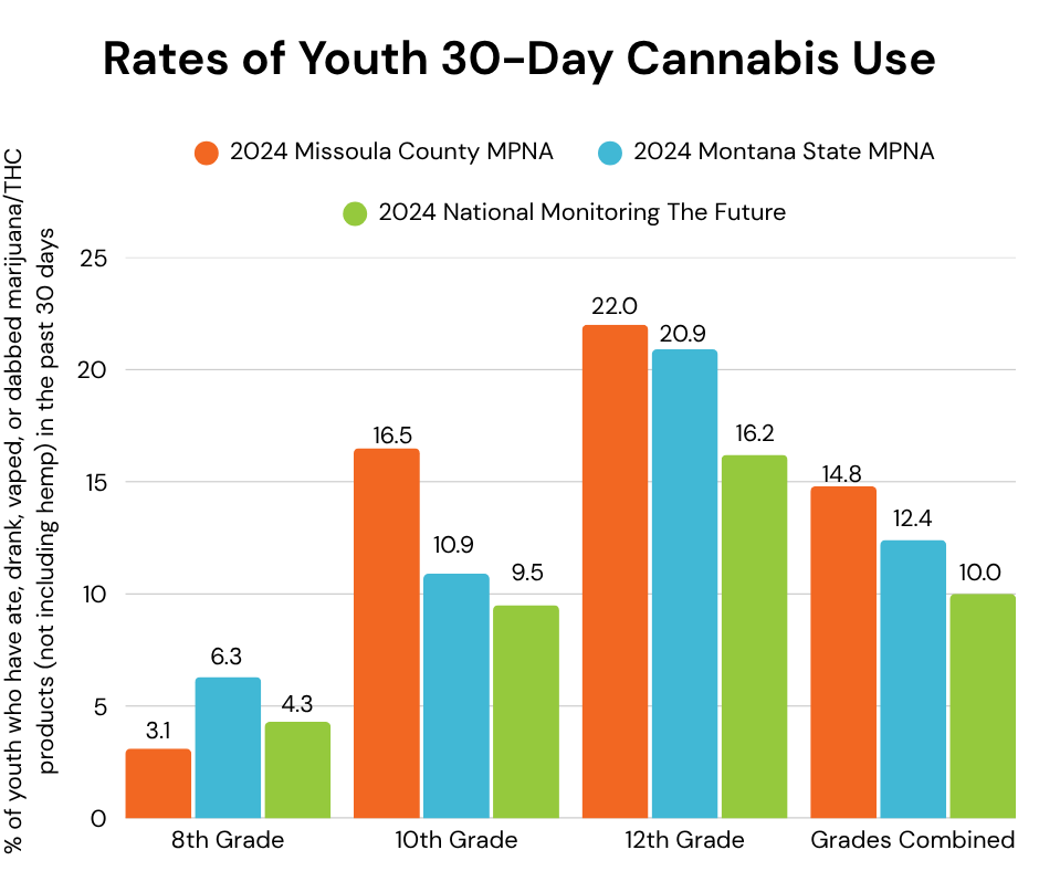 % of youth who have ate, drank, vaped, or dabbed marijuana/THC products (not including hemp) in the past 30 days. Data is from the Montana Prevention Needs Assessment (MPNA) and Monitoring the Future.