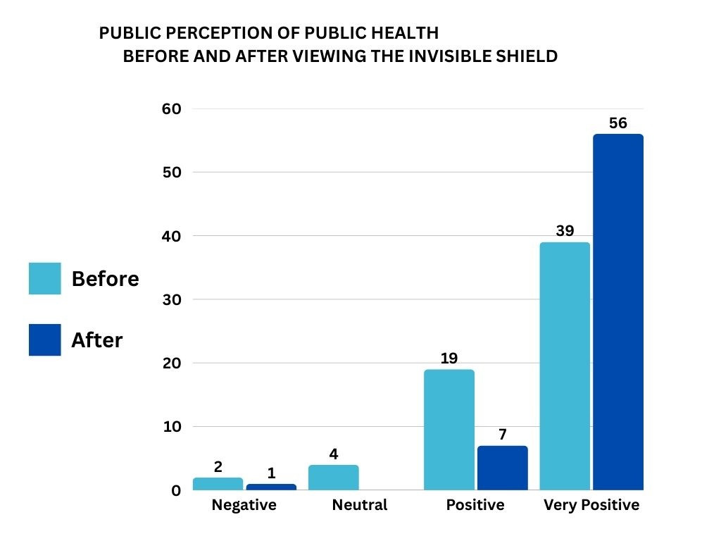 The film series is designed to deepen the understanding of public health. A total of 64 community members filled out an event survey. Prior to watching the film, 58 attendees reported having a positive/very positive opinion of public health, with 4 reporting a neutral opinion. After watching the film and participating in the facilitated community conversation, 63 attendees reported feeling positive/very positive about public health. We are pleased the film series positively impacted them and helped shift their perceptions and awareness of public health.
